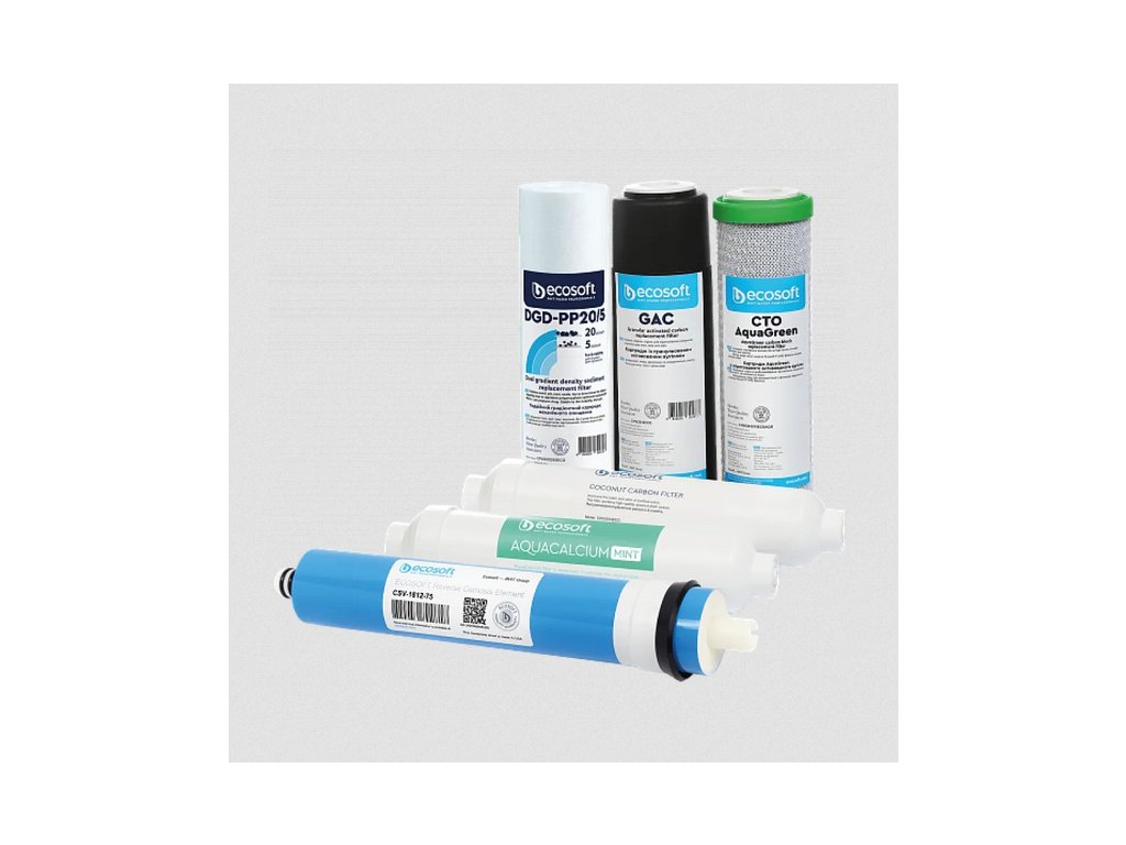 Tento kompletní 6dílný set je určen pro průběžný servis filtrů reverzní osmózy Ecosoft PURE AquaCalcium Mint. Obsahuje všechny klíčové vložky včetně RO membrány 75 GPD a mineralizační patrony AquaCalcium, která vrací do vody vápník pro vyváženou chuť. Set je koncipován jako „12 měsíců“ – tedy k plnému ročnímu servisu systému.